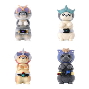 犬たちが仮面ライダーの姿に変身したユニークなフロッキー仕様のガシャポンです。全4種のフルコンプリートセットでコレクションにもおすすめです。